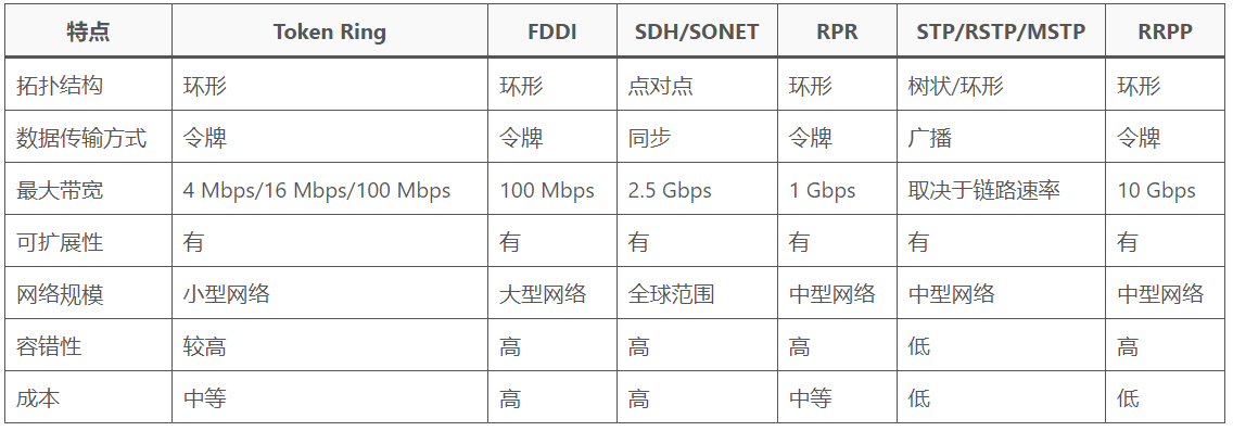 综上所述,Token Ring、FDDI、SDH/SONET、RPR、STP/RSTP/MSTP和RRPP是不同的网络技术和协议,在拓扑结构、数据传输方式、带宽、可扩展性、网络规模、容错性和成本等方面存在差异。