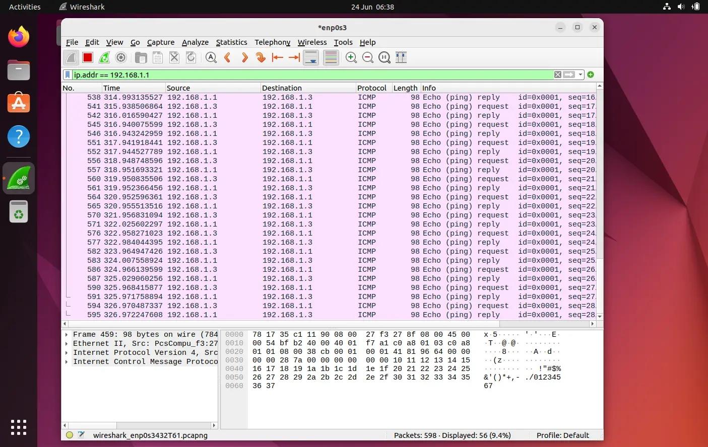 我们选择 “enp0s3” 来捕获该接口的网络流量。选择接口后,我们网络上所有设备的网络数据包开始填充(请参阅下面的截图):