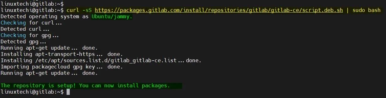 $ curl -sS https://packages.gitlab.com/install/repositories/gitlab/gitlab-ce/script.deb.sh | sudo bash