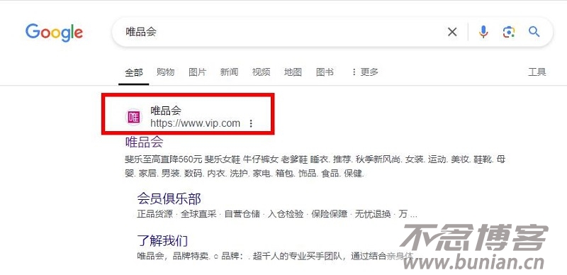 1、打开浏览器输入关键字“唯品会”,注意查看网址,这里第一个就是点击它进入,或是直接输入上方网址进入。