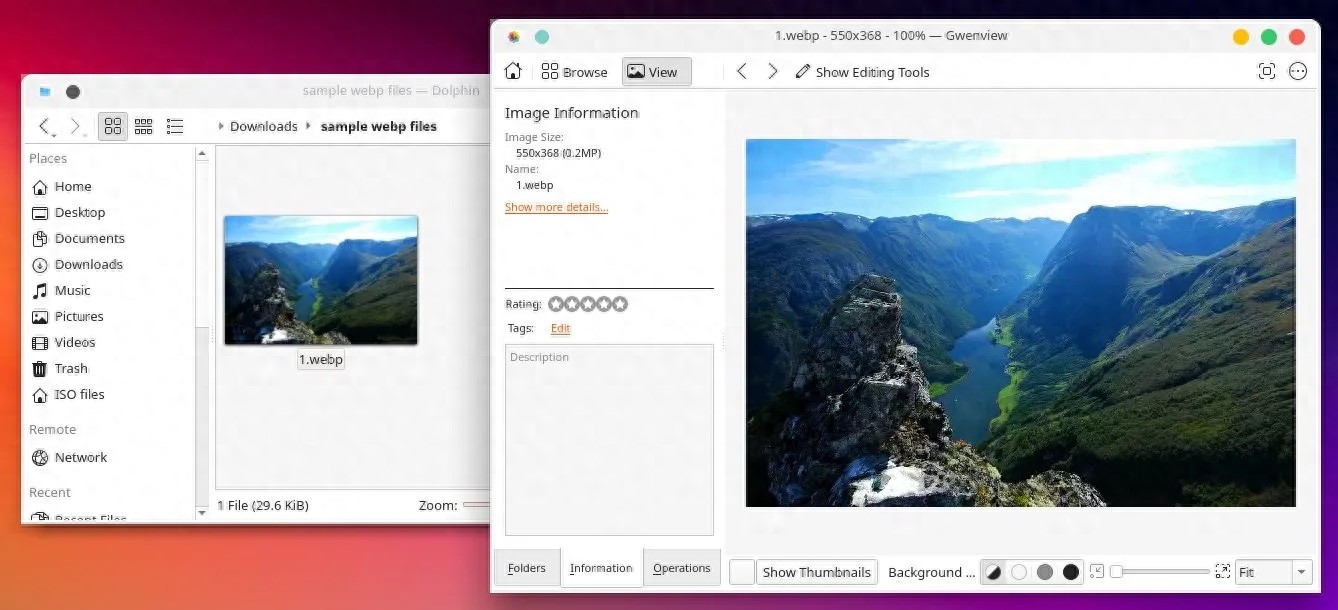 KDE 默认的图像查看器 Gwenview 原生支持 WebP 格式,因此,你无需额外的安装步骤就可以查看 WebP 图像。另外,Dolphin 文件管理器也可以很好地展示 WebP 格式的缩略图。
