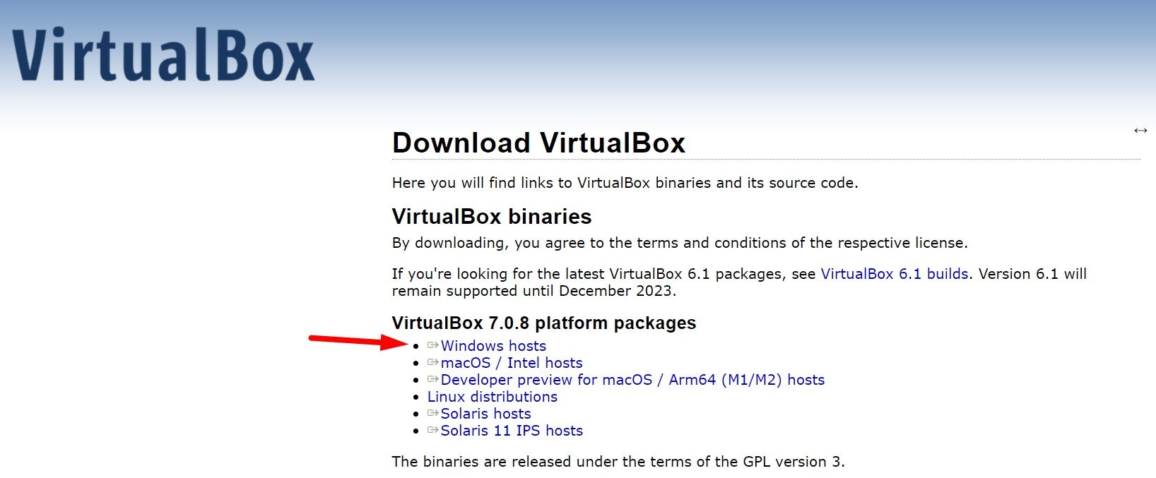 要开始使用,请前往 VirtualBox 的官方下载页面。单击 “Windows host” 选项下载 .exe 安装程序。