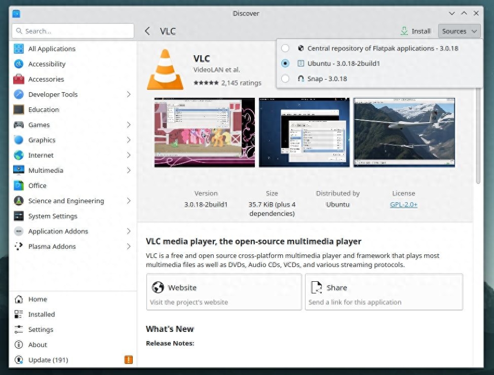 提及 Kubuntu,你得到的软件管理器是 “发现Discover” 应用。你也可以从软件仓库以及 Snap 包中安装应用。