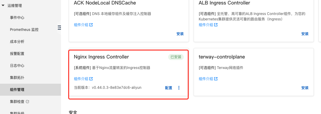 如果是使用阿里的ack集群,可直接在”运维管理”-“组件管理”-“核心组件”里选择该组件直接进行安装,默认且推荐安装在kube-system命名空间下
