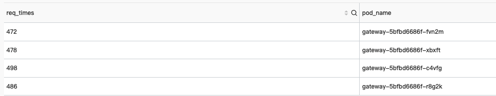 下面验证一下其是否真的是基于请求级别的负载均衡. 前置条件:4个pod,1个client连接,分别以slb和Ingress的方式请求同一接口,持续70秒,看请求具体的响应情况