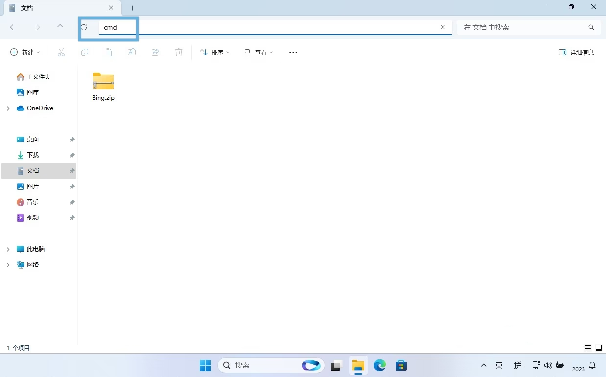 2、在顶部导航栏中运行cmd ,来打开「命令提示符」工具。