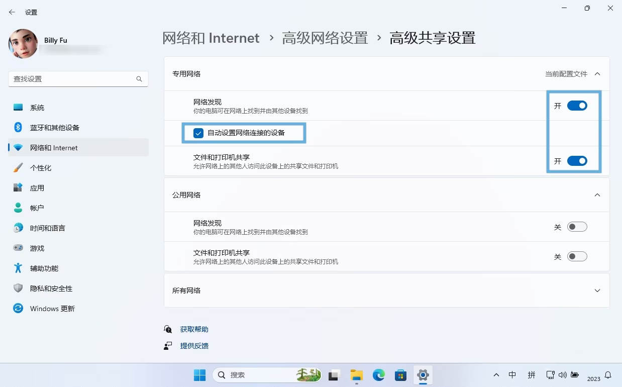 「网络发现」的设置会根据你的网络配置文件类型自动调整。