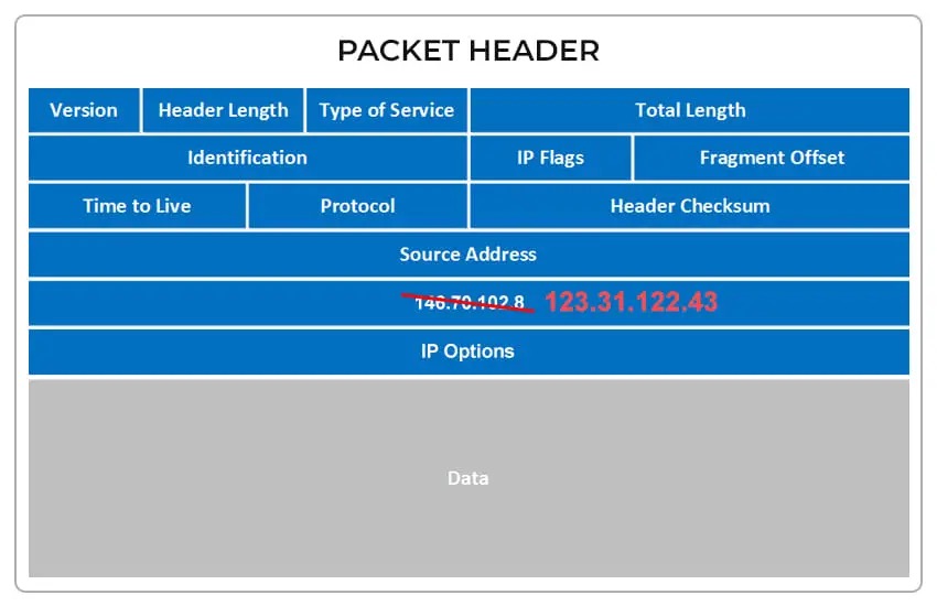 在 IP 欺骗中,攻击者会更改数据包头部的 IP 地址信息,伪装成另一个可信来源。