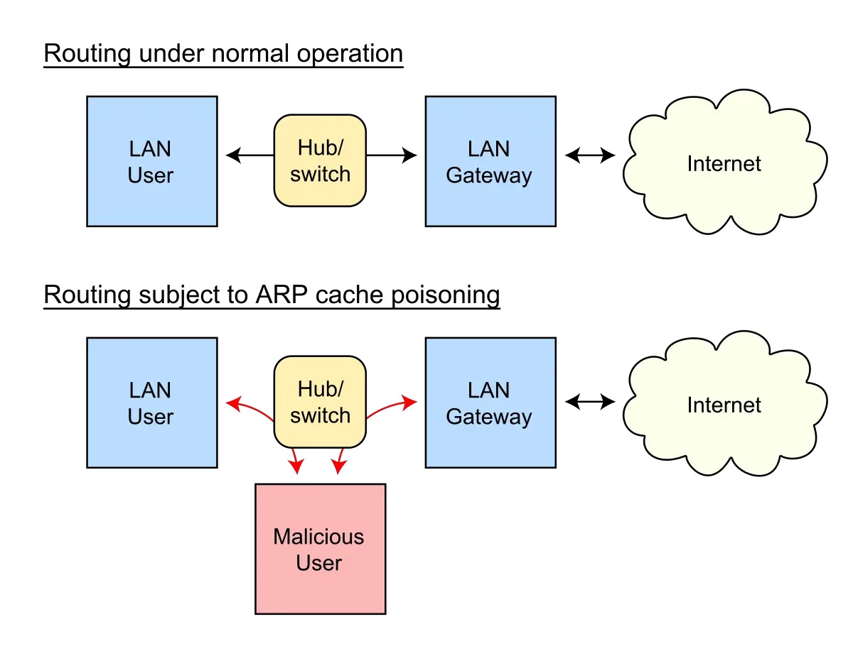 ARP 欺骗,也称为「ARP 投毒」,攻击者会将自己的恶意 MAC 地址与特定 IP 地址关联,从而劫持网络流量。当用户访问某个 URL 或 IP 地址时,数据请求就会被引导至攻击者。这种方法通常用于局域网(LAN)中。