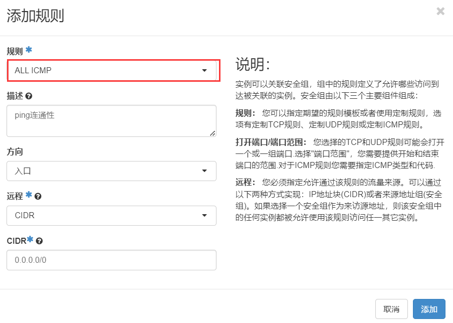 由于后面实验中需要用到外部网络通过SSH登录虚拟机,同时用ping工具测试连通性,所以下面添加规则: