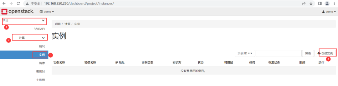 上在工作完成后,下面就可以创建虚拟机实例。这里还是以demo身份登录系统进行创建: