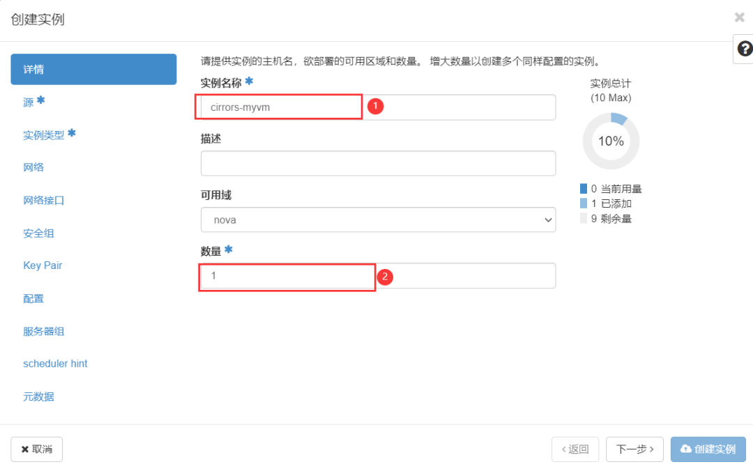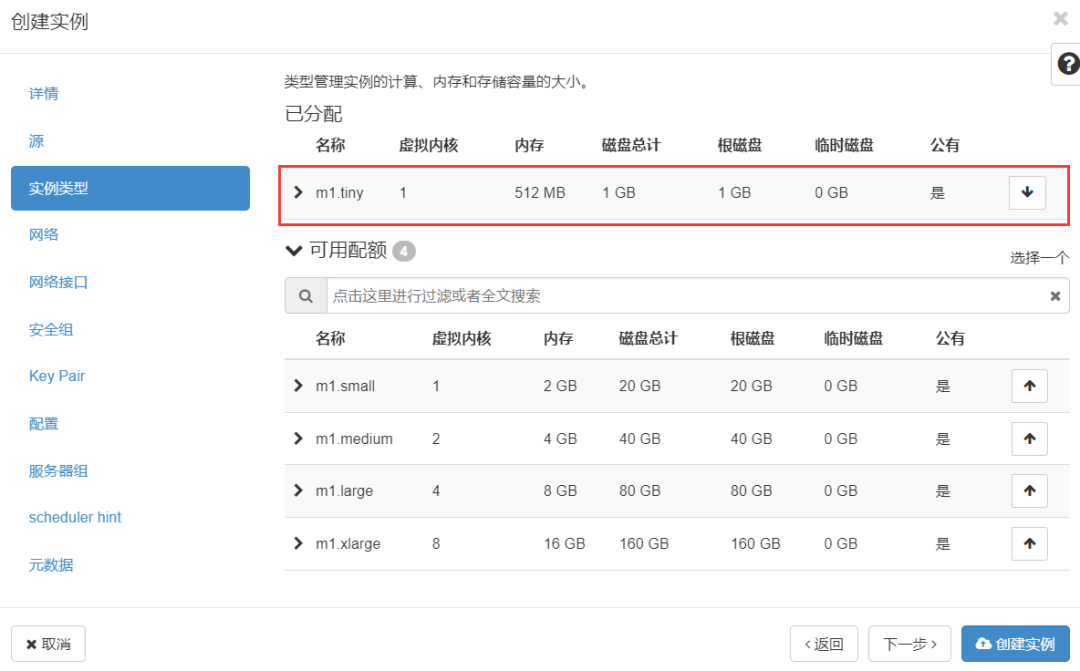 同第一个实例创建方法一样,这里只是注意卷大小的选择,根据镜像和系统文件大小来选择,另外,就是实例类型,根据需要选择合适的实例类型: