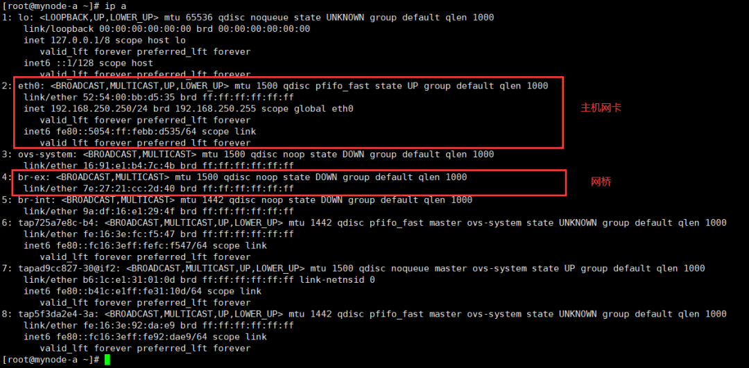 可以看出,外部网桥br-ex获得源eth0网卡的IP地址192.168.250.250,而eth0网卡作为该网桥上的一个端口后,可以没有IP地址。