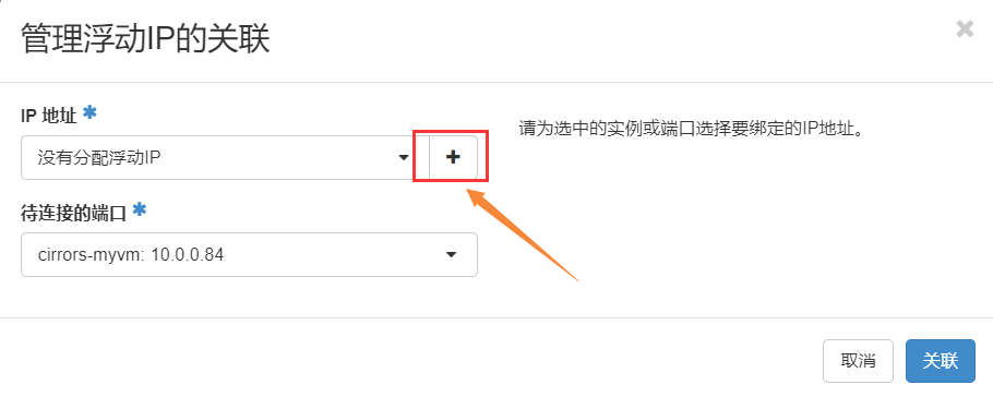 在弹出管理浮动IP的关联窗口,由于没有分配浮动IP,点击其右侧加号: