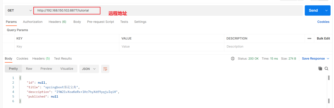 项目运行成功之后,在Postman输入远程服务器的地址http://192.168.150.102:8877/tutorial,就可以访问了: