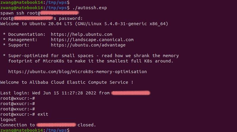 通过脚本可以看到,第一行不是常规Shell脚本的”#!/bin/bash”了,表示该脚本由expect这个工具解析执行,所以文件名以.exp后缀也是可以的。