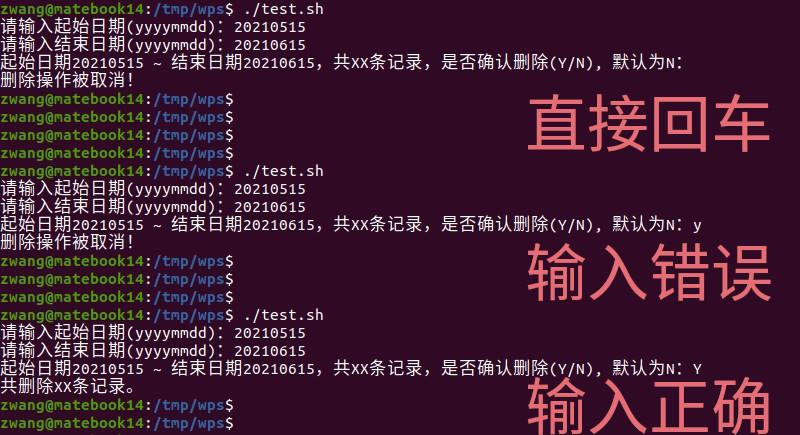 read -p "起始日期$d1 ~ 结束日期$d2,共XX条记录,是否确认删除(Y/N), 默认为N:" c