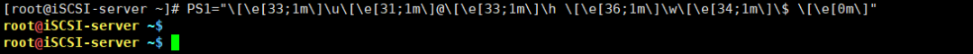 [root@iSCSI-server ~]# PS1="\[\e[33;1m\]\u\[\e[31;1m\]@\[\e[33;1m\]\h \[\e[36;1m\]\w\[\e[34;1m\]$ \[\e[0m\]"