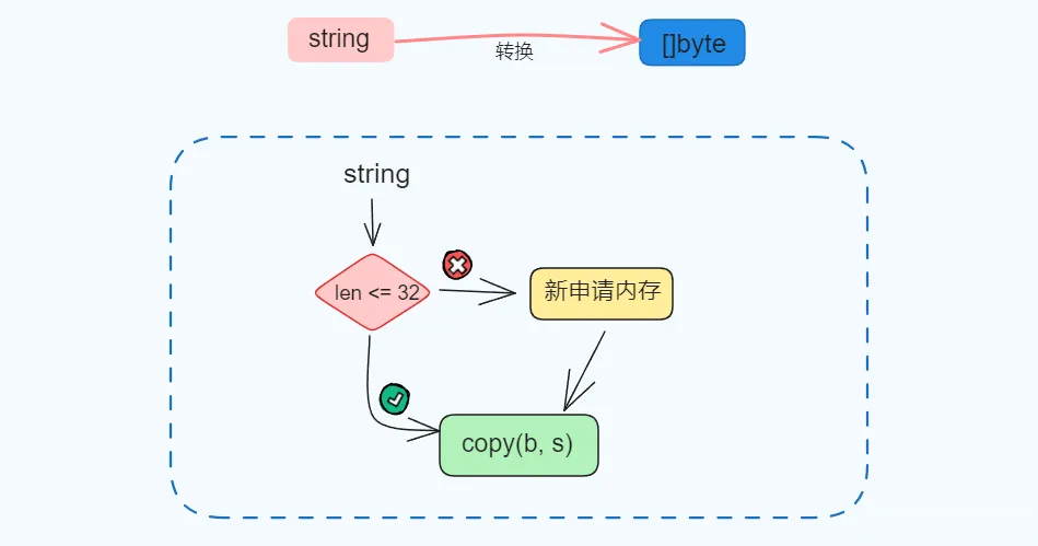 跟string转[]byte一样,当数组长度超过32时,同样需要调用mallocgc分配一块新内存