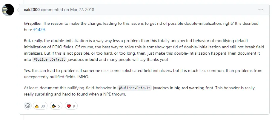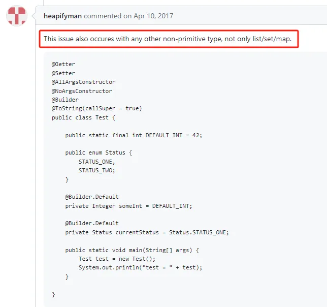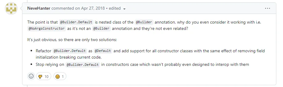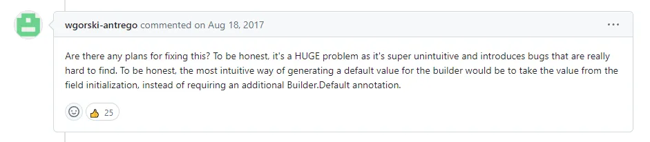 同时他还抛出了一个观点:老实说,为字段生成默认值的最直观方法就是从字段初始化中获取值,而不是需要额外的 Builder.Default 注解来标记。