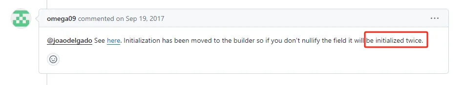 然后把“重复初始化”写到 @Builder.Default javadocs 中,大不了再给这几个字加个粗。