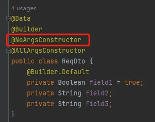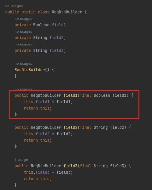 没有@Builder.Default 注解的时候,class 文件中 ReqDtoBuilder 类中关于 field1 字段是这样的: