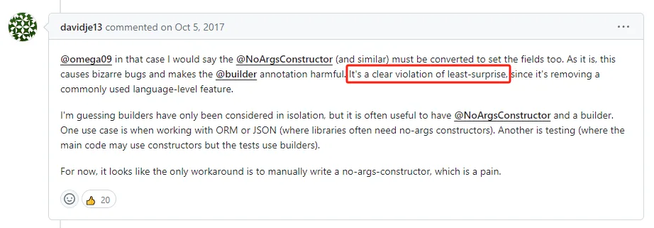 接着一个叫做 davidje13 的老哥接过了话茬,顺着 omega09 老哥的话往下说,他除了解释两个注解放在一起使用的场景外,还提到了一个词:least-surprise。