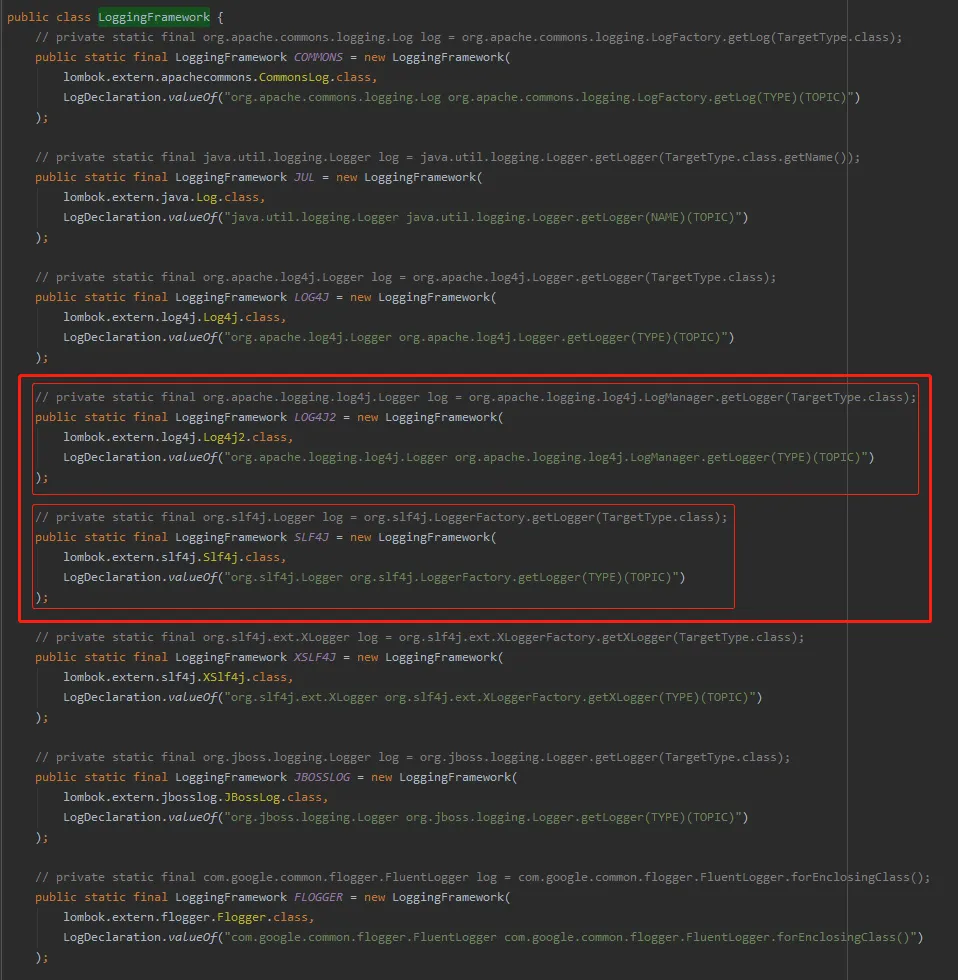 这个里面把每个注解需要生成的 log 都硬编码好了。正是因为这样,Lombok 才知道你用什么日志注解,应该给你生成什么样的 log。