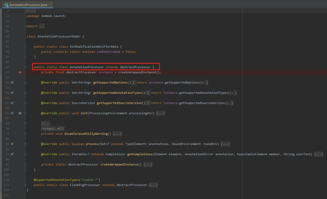 AnnotationProcessorHider 这个类里面有两行静态内部类,我们看其中一个, AnnotationProcessor ,它是继承自 AbstractProcessor 抽象类: