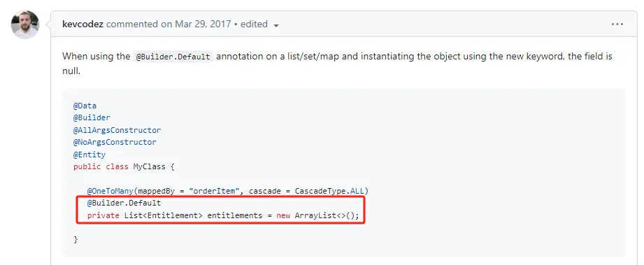 虽然我没有找到关于 @Builder.Default 注解存在的意义的官方说明,但是我在 github 上找到了这个一个链接: