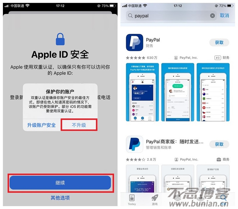 2、选择“其他选项”和“不升级”按钮即可跳过双重认证,登录成功后搜索PayPal,点击获取按钮即可下载。