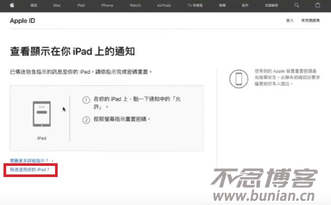 4、此时需要在你绑定了此苹果id的设备上按照提示进行操作重置密码即可,如果此设备不在你的身边点击下方“无法使用你的iPad”按钮。