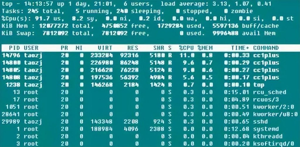 最后是每个程序的资源占用列表,其中 CPU 的使用率是所有 CPU core 占用率的总和。通常执行 top 的时候,本身该程序会大量的读取 /proc 操作,所以基本该 top 程序本身也会是名列前茅的。