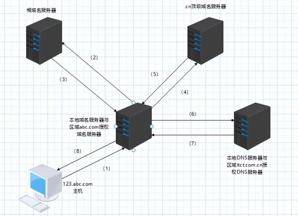 主机有域名解析的需求时,首先查询本地域名服务器,如果成功,则由本地域名服务器反馈结果;如果失败,则查询上一级域名服务器,然后由上一级域名服务器完成查询。下图是递归查询的过程: