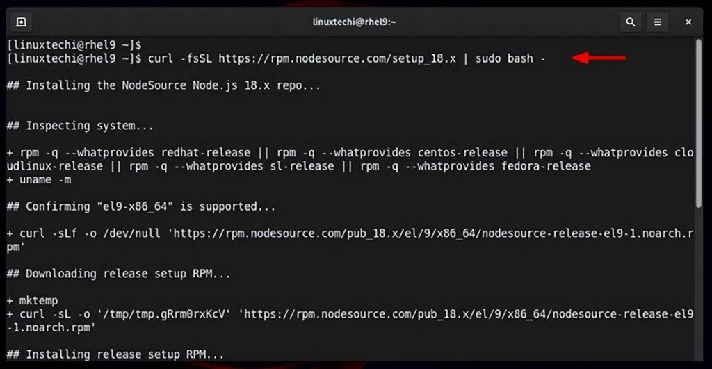 $ curl -fsSL https://rpm.nodesource.com/setup_18.x | sudo bash -