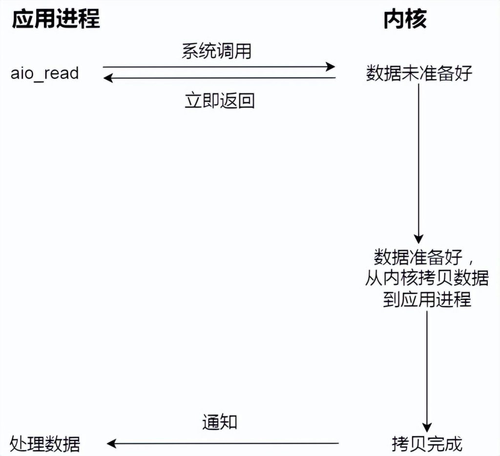 当我们发起 aio_read 之后,就立即返回,内核自动将数据从内核空间拷贝到应用程序空间,这个拷贝过程同样是异步的,内核自动完成的,和前面的同步操作不一样,应用程序并不需要主动发起拷贝动作。过程如下图: