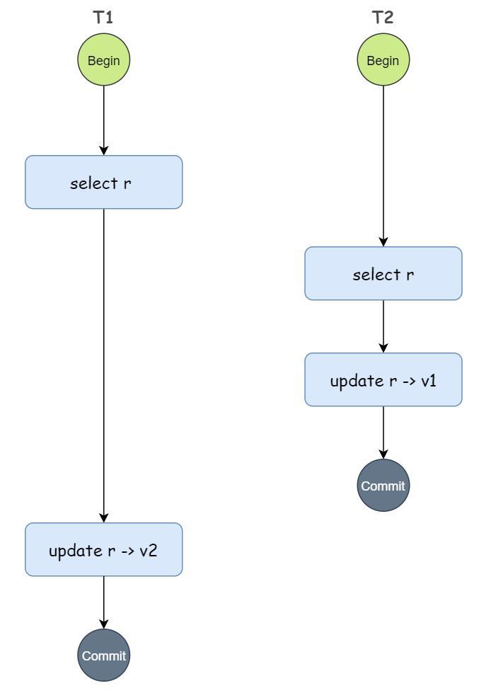 1)事务 T1 将行记录 r 更新为 v1,但是事务 T1 并未提交