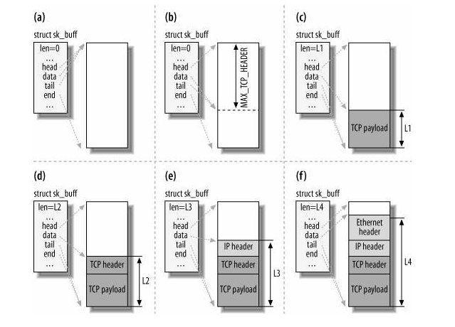 - 当要发送报文时,创建 sk_buff 结构体,数据缓存区的头部预留足够的空间,用来填充各层首部,在经过各下层协议时,通过减少 skb->data 的值来增加协议首部。
