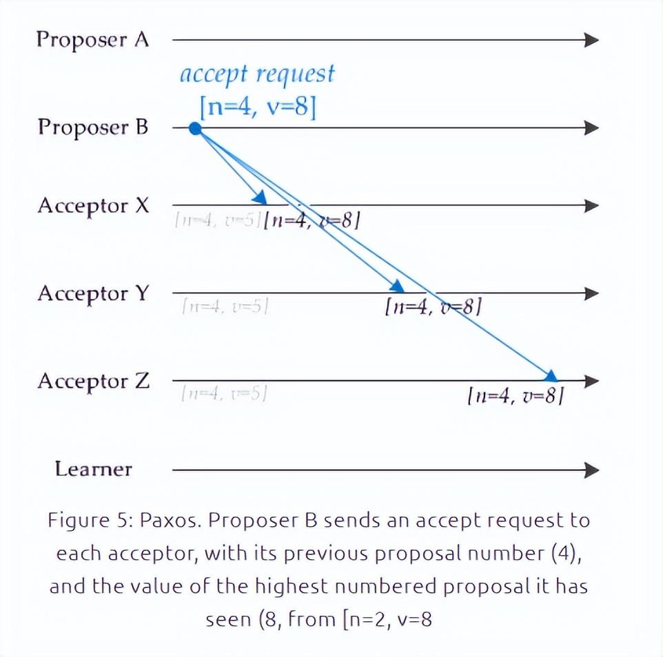 Proposer B 过后也收到了两个提议响应,因此也开始发送接受请求。需要注意的是,接受请求的 v 需要取它收到的最大 v 值,也就是 8。因此它发送 [n=4, v=8] 的接受请求。