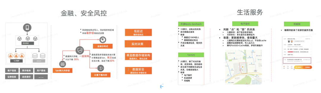 在金融、安全风控方面,Tair里面做了一些计算的算值,可以在某一个时间段里面譬如购买商品的数量,这一类的计算来做防黄牛反作弊。