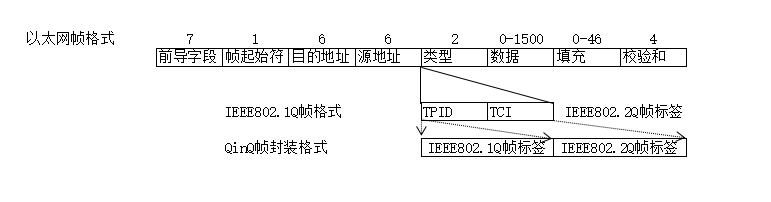 QinQ是在传统IEEE802.1Q VLAN标签头的基础上,增加一层新的IEE802.1QVLAN标签头。QinQ帧格式如下如所示: