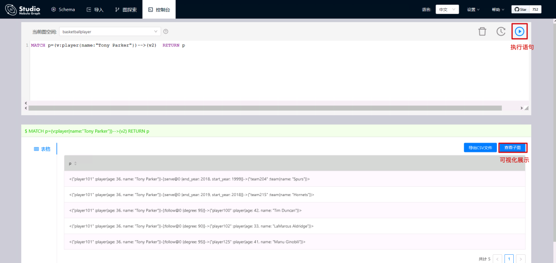 接下来通过查询和 Tony Parker 有关系的球员,同样可以以可视化的方式展示结果。