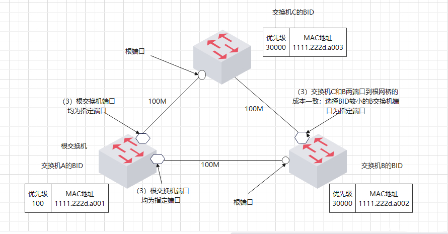 2)如果到达根网桥的开销相同,再比较上一级(接收BPDU方向)发送者的桥ID,选择发送者桥ID最小的对应的端口;