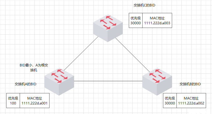 每台交换机都有一个唯一的网桥ID(BID),最小BID值的交换机为根交换机。其中BID由2字节的网桥优先级字段和6字节的MAC地址字段组成。下图所示描述了根网桥的选择过程: