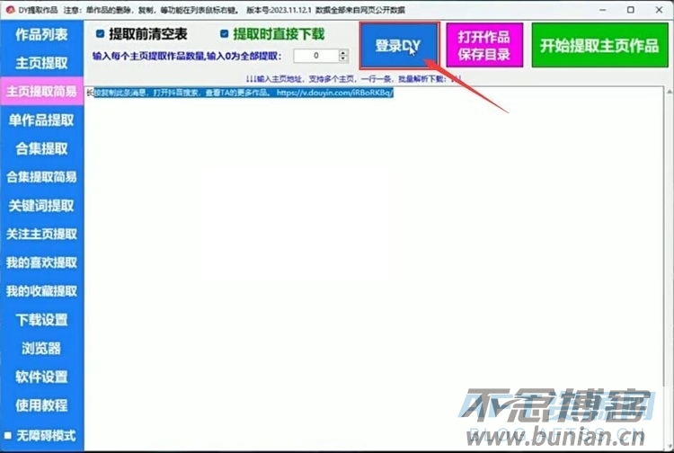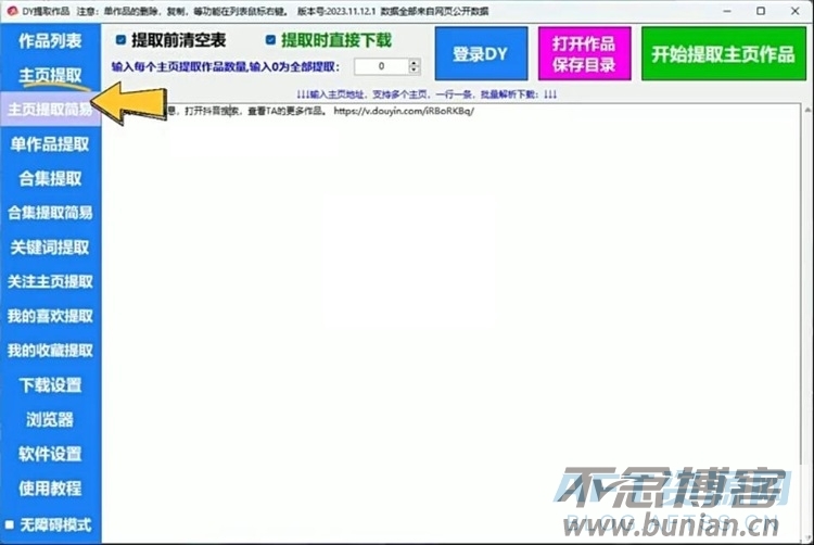 1、我们打开软件过后,选择“主页提取简易”,然后把作者主页链接粘贴到中间空白框里面。