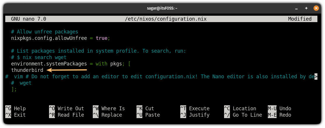 要使用 Nix 配置文件安装软件包,你必须在配置文件中输入软件包的名称、重建,然后切换到配置文件,就可以了。