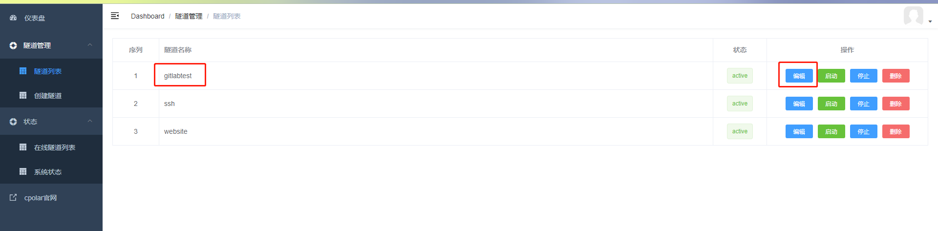 登录cpolar web ui管理界面。点击左侧仪表盘的隧道管理——隧道列表,找到需要配置二级子域名的隧道,点击右侧的编辑