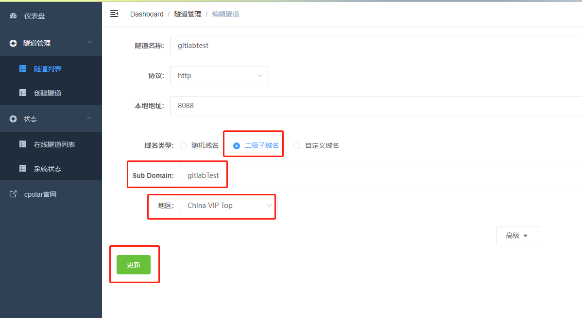 隧道更新成功后,点击左侧仪表盘的状态——在线隧道列表,可以看到隧道的公网地址,已经更新为二级子域名了,将公网地址复制下来。
