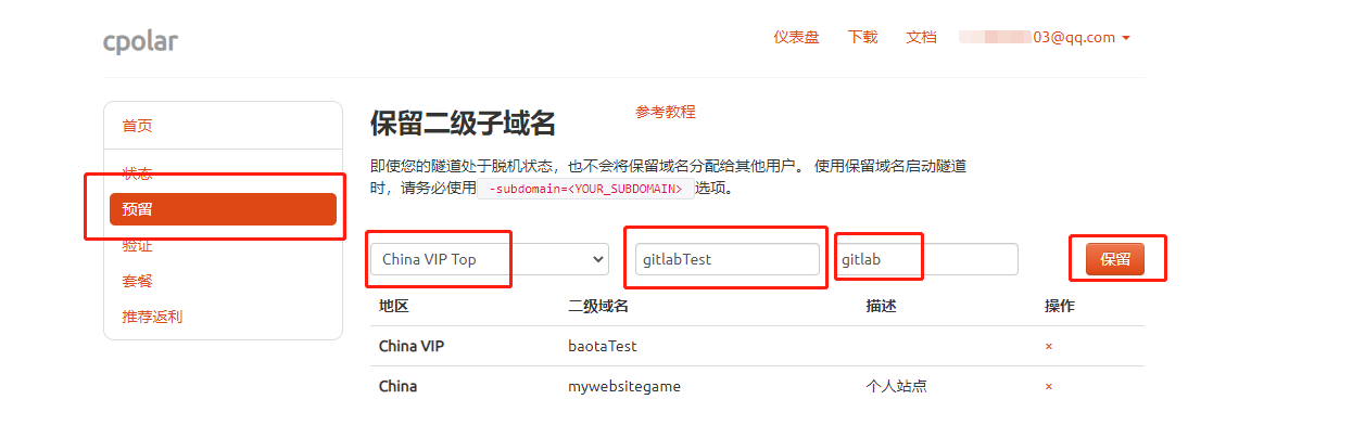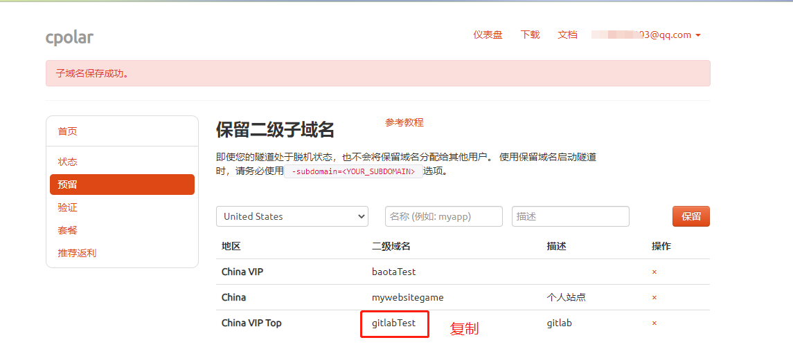 本例保留一个名称为gitlabTest的二级子域名。子域名保留成功后,我们将子域名复制下来,接下来需要将其配置到隧道中去。