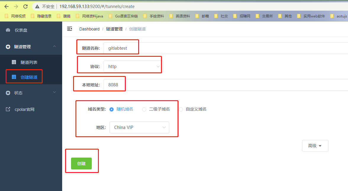 登录成功后,点击左侧仪表盘的隧道管理——创建隧道,创建一个http协议的隧道指向上面设置的8088端口: